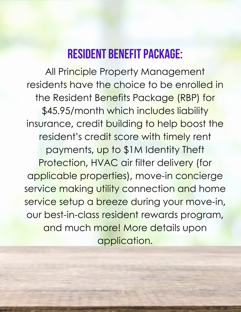 All Principle Property Management residents have the choice to be enrolled in the Resident Benefits Package (RBP) for $45.95/month which includes liability insurance, credit building to help boost the resident’s credit score with timely rent payments, up to $1M Identity Theft Protection, HVAC air filter delivery (for applicable properties), move-in concierge service making utility connection and home service setup a breeze during your move-in, our best-in-class resident rewards program, and much more! More details upon application.